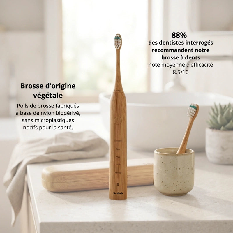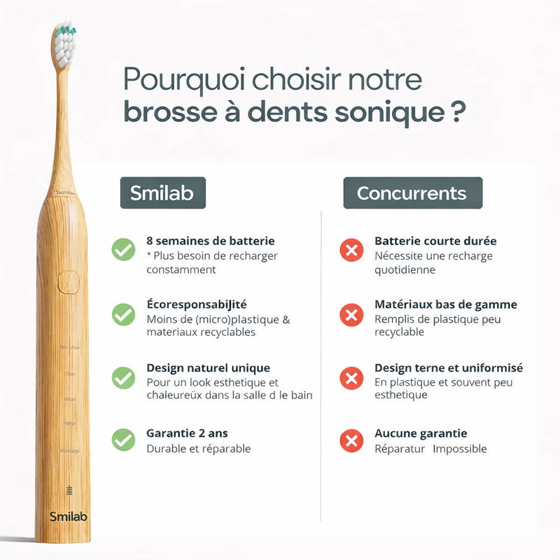 La Smilab combine innovation, performance et respect de l'environnement comme aucune autre. Avec sa technologie sonique avancée, son design élégant en bambou et son autonomie record, elle transforme votre routine de brossage en un geste à la fois ultra-efficace, agréable et éco-responsable. C'est le futur de l'hygiène bucco-dentaire, disponible dès aujourd'hui pour vous.